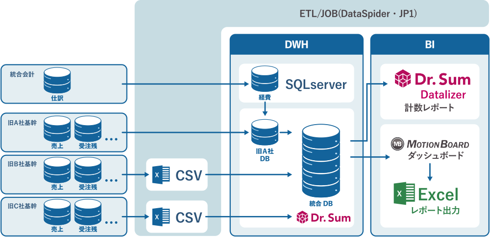 既存のDWH/BIサーバーを活用。旧B社、C社のデータはCSV形式でDWH/BIサーバーに配置。