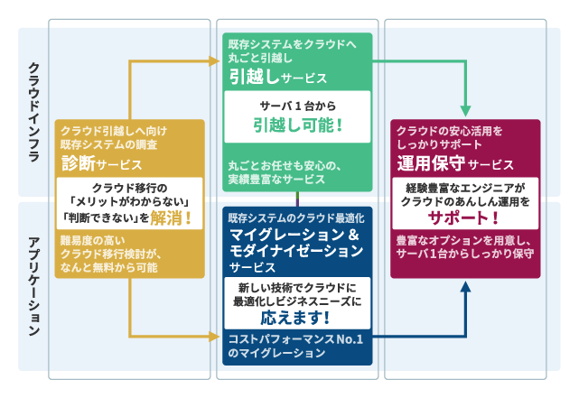 既存システムをクラウドへ引越しする「クラウドワープ」、異なるデータベースへの移行を支援する「異種データベース間移行サービス」により、お客様のシステムをAzure環境に移行します。