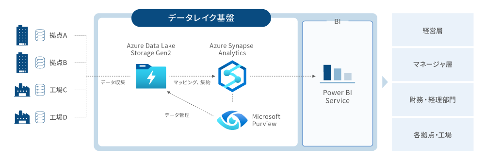 - Azureサービスデータプラットフォームを導入し、各事業・拠点のデータを一カ所に統合してコードの標準化や集約をすることで、様々な視点で素早くデータ活用を行うことができる基盤を構築。