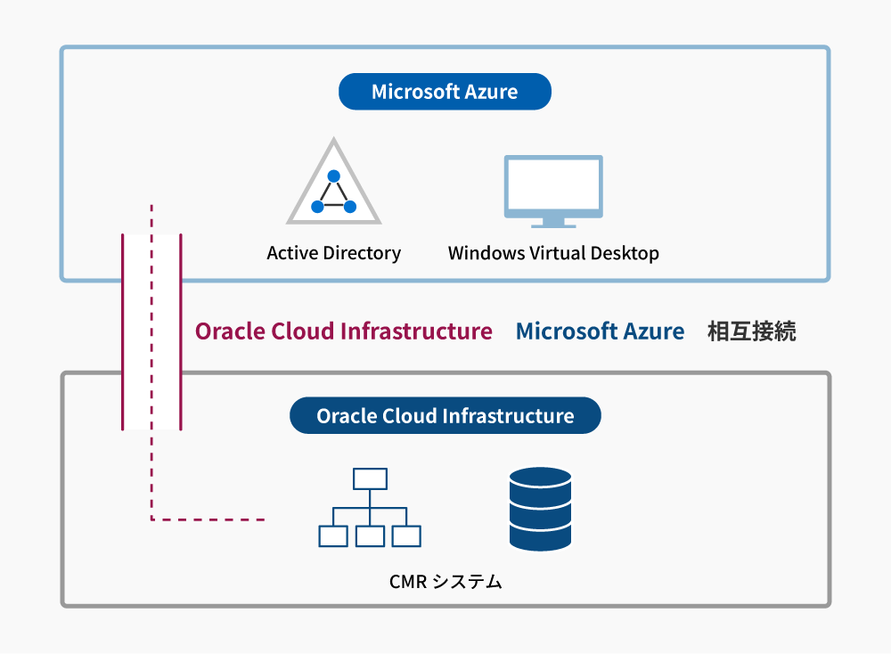 これらの課題を解決するために社内システムをOracle CloudとMicrosoft Azureへ移行し、Oracle CloudとMicrosoft Azure間の通信として相互接続を活用しています。