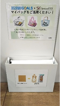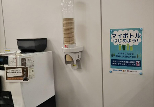 当社では資源循環の取り組みとして、会社の名刺や封筒、ノベルティで使用しているノート、ティーサーバーで使用している紙コップ、オフィス消耗品等、あらゆる紙製品にグリーン商品やFSC認証紙※を積極的に取り入れています。また廃棄物削減の観点から、マイボトルの使用推進運動も全社で展開しています。その結果、2024年10月には、ひと月あたりの紙カップ消費量が全社で9%削減、本社では25%削減となりました。さらにプラスチックごみ対策として、使用するクリアファイルに一部紙製のものを導入しているほか、本社でマイバッグを設置し活用を呼びかけることで、昼食など買い物時のレジ袋削減に取り組んでいます。